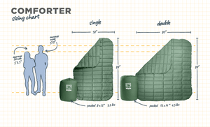 The HEST Comforter, offered in both a single and double size, is designed based upon the science of better sleep to provide the comfort and warmth of your home comforter in a packable, smart, outdoor ready design. The Comforter features 100% recycled polyester fill with no hot melt bonding, outdoor-ready-easy-to-clean fabric, and a clever cinch & tuck footbox design. The footbox keeps the comforter in place & supports thermoregulation throughout the night by allowing glabrous skin ( hands & feet) to easily stick out into fresh air and regulate your body temperature as needed for an optimal sleep experience outdoors. Unlike your traditional sleeping bag, your feet and hands can roam free of constriction! Smart features like top sheet loops and a cinch compression sack make the comforter easy to store, pack, & clean. Cozy up to the best outdoor comforter and sleep better with HEST.